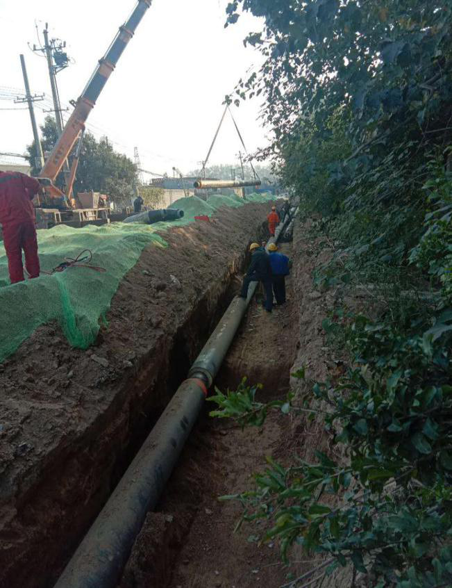 為了能夠讓電廠家屬院能夠在供暖季正常用暖,公司對該項目工地實行分段施工,分班次、加班加點搶工期。10月上旬完成了電廠北門溝槽的開挖工作,10月16日起,開始向溝槽下放熱力管道。